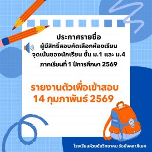 ประกาศรายชื่อผู้มีสิทธิ์สอบคัดเลือกห้องเรียนจุดเน้นของนักเรียน ม.1 และ ม.4 1/2569